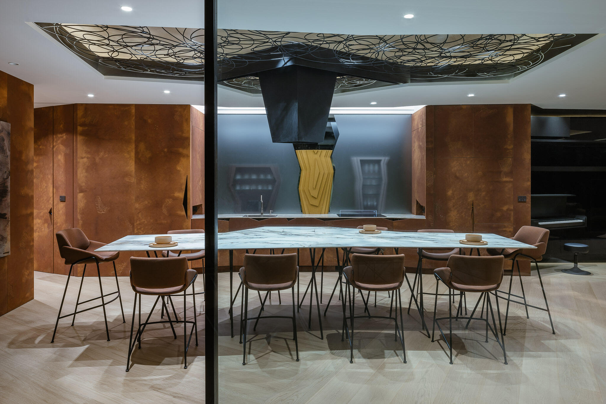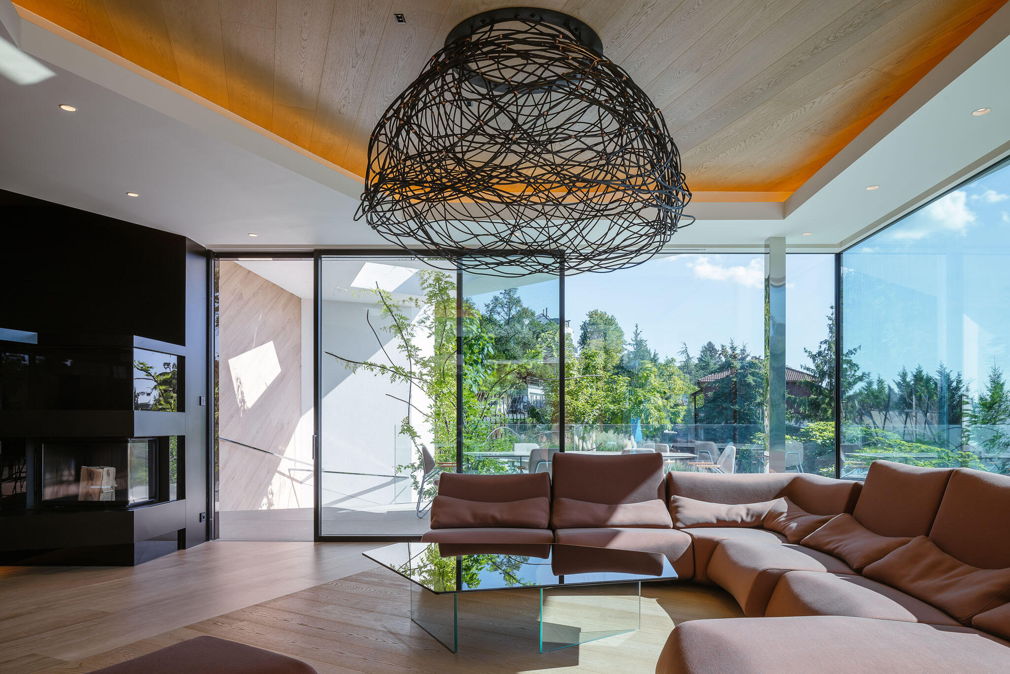 Dům má světově jedinečný způsob velmi výkonného a zcela umělecky pojatého topení a chlazení s bleskovým nástupem a schopnosti okamžité reakce na změnu slunečních podmínek. Jedná se o skulptury, které jsou v různých podobách pod stropem v každé místnosti. Hned ve vstupní hale vás tak ohromí skulptura dvou levitujících pan, které se přetahují o deku, vedle v jídelně je pod stropem spirálovité mračno zakomponováno do originálního digestoře nad v ostrově skrytým tepan-yaki grilem, a za ním v obýváku vás zaujme velký lustr.