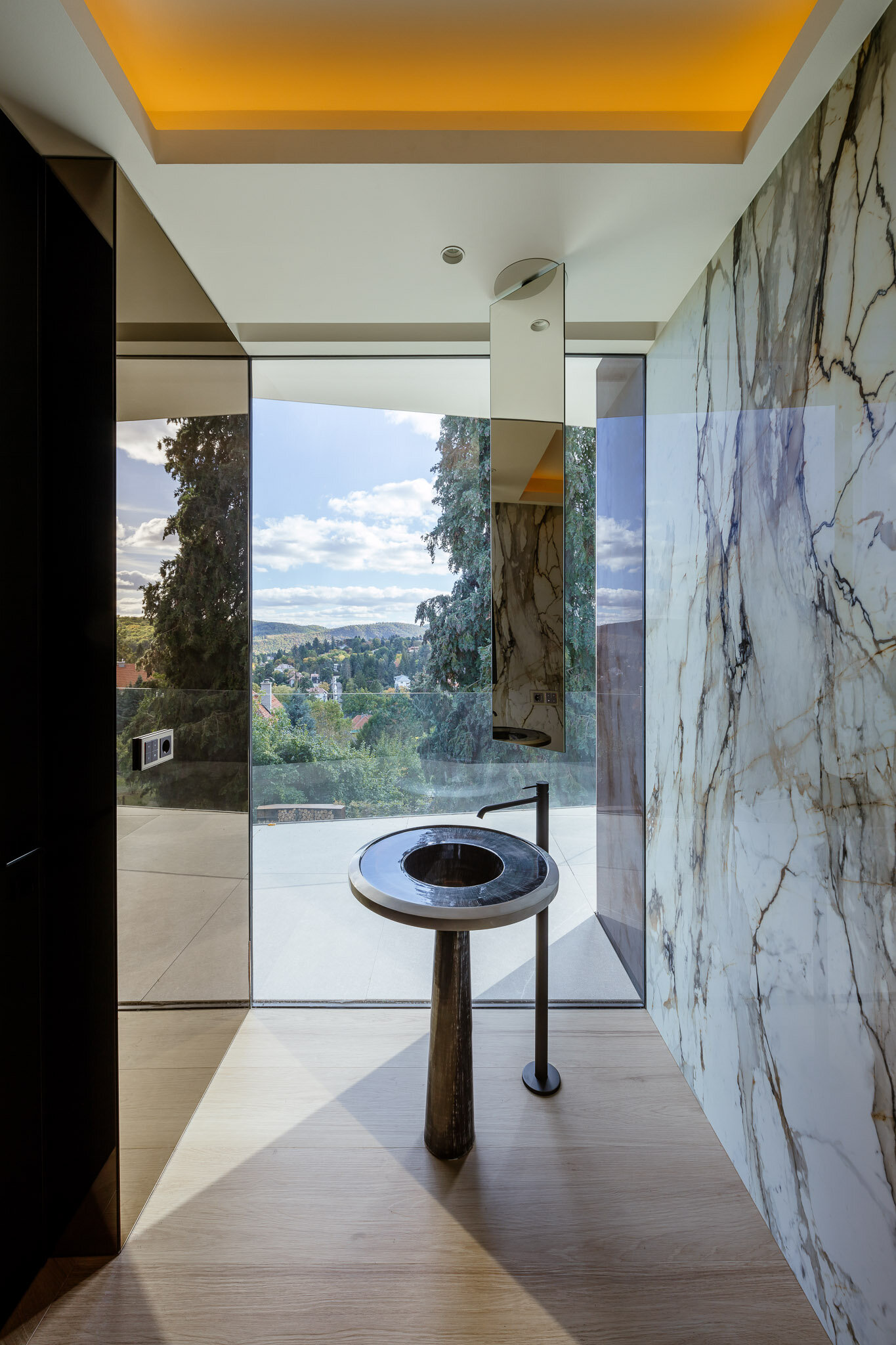 Dům navržen tak, aby vytěžil maximum z daného místa jeho světové orientace, tvaru pozemku i terénu. V tomto domě jsou všechny místnosti s velkolepým výhledem, který se dané místě nabízí. Zároveň zde všechny místnosti mají zajištěné neméně nutné soukromí. Nejen z domu, také ze všech částí zahrady zůstává tento výhled zajištěn, výhled tady má i parkovací terasa, garáž, garáž pro obytné auto, venkovní tělocvična, sauna i koupelny, prostě všechny místnosti... protože výhledy jsou tu impozantní a nejde je nevyužít.