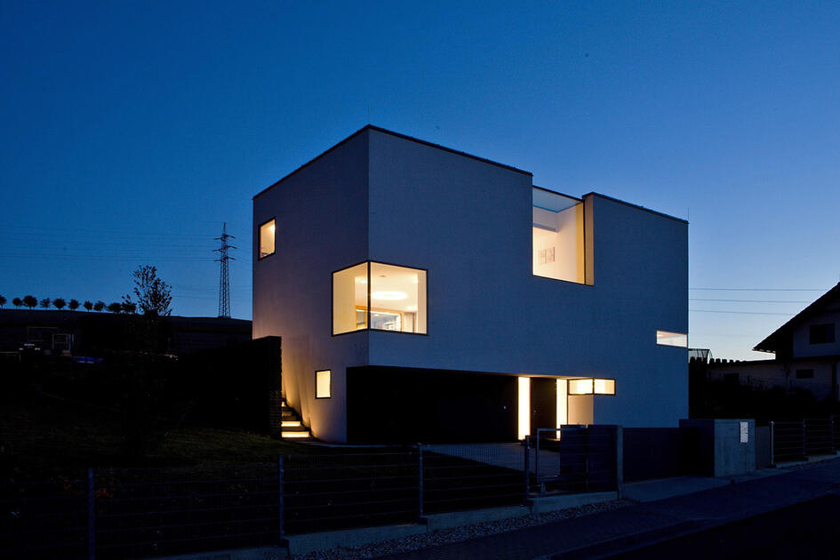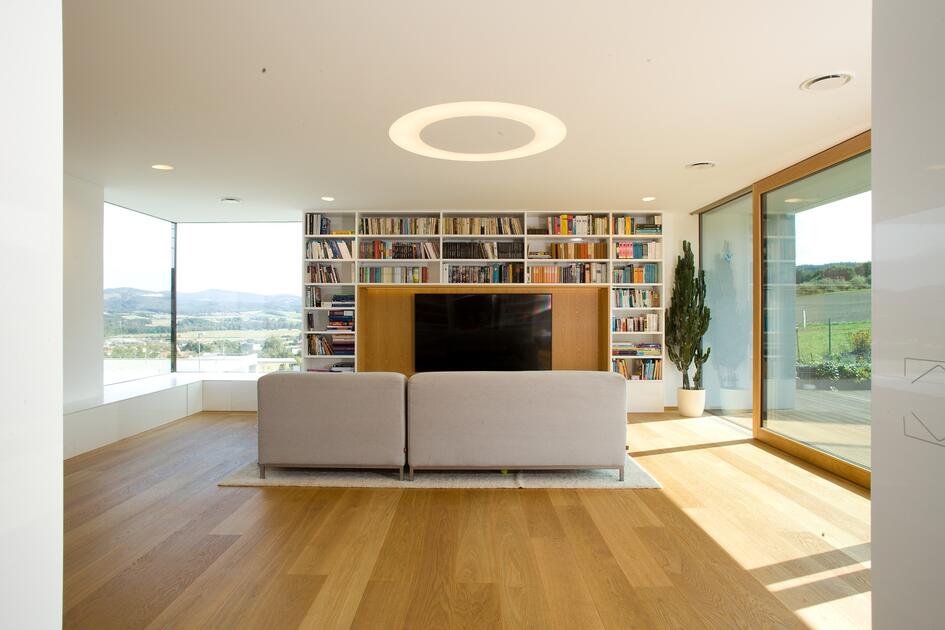 Zásadním prvkem na domě je okno, které přechází ve střešní světlík. Je kompletně řešeno bezrámové, včetně zlomu skla. Přední sklo je rozměru 3x3,5 m a za zlomem pokračuje ještě 2 m do střechy.