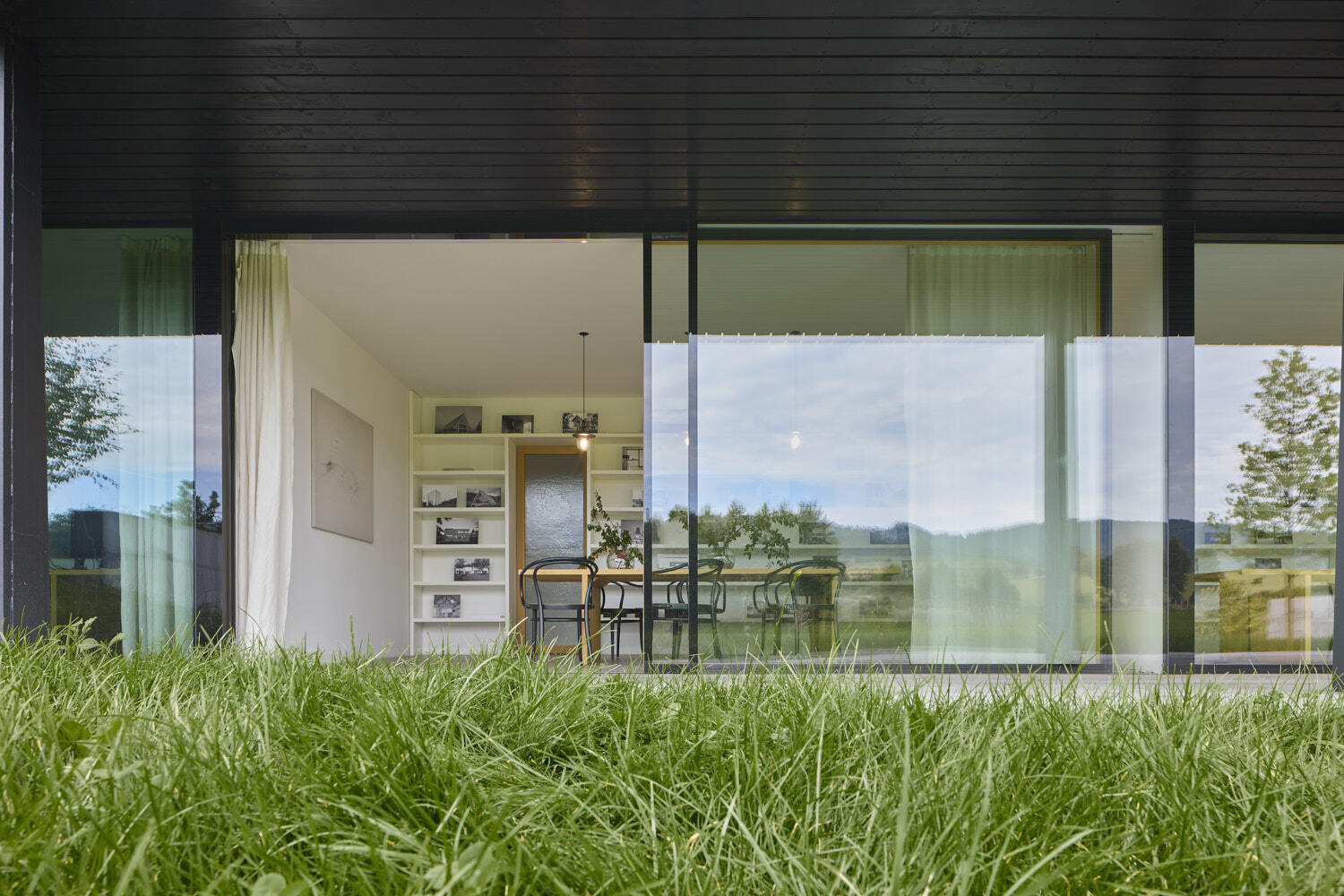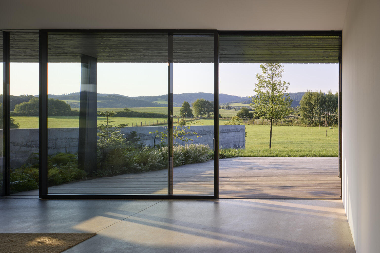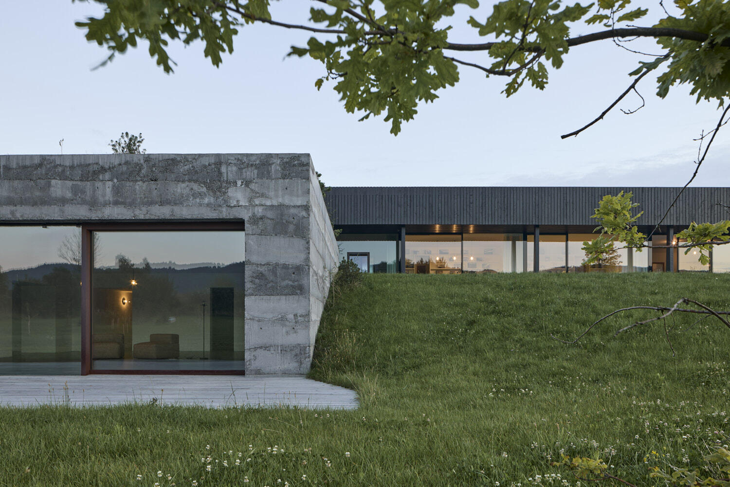 Aby vyzněly pravé podstaty oken, dostal dům náruč, která přivádí louku a propojuje interiér a zahradu v jeden prostor. Otevřel se dalekým výhledům i síle atmosfér zvenčí.